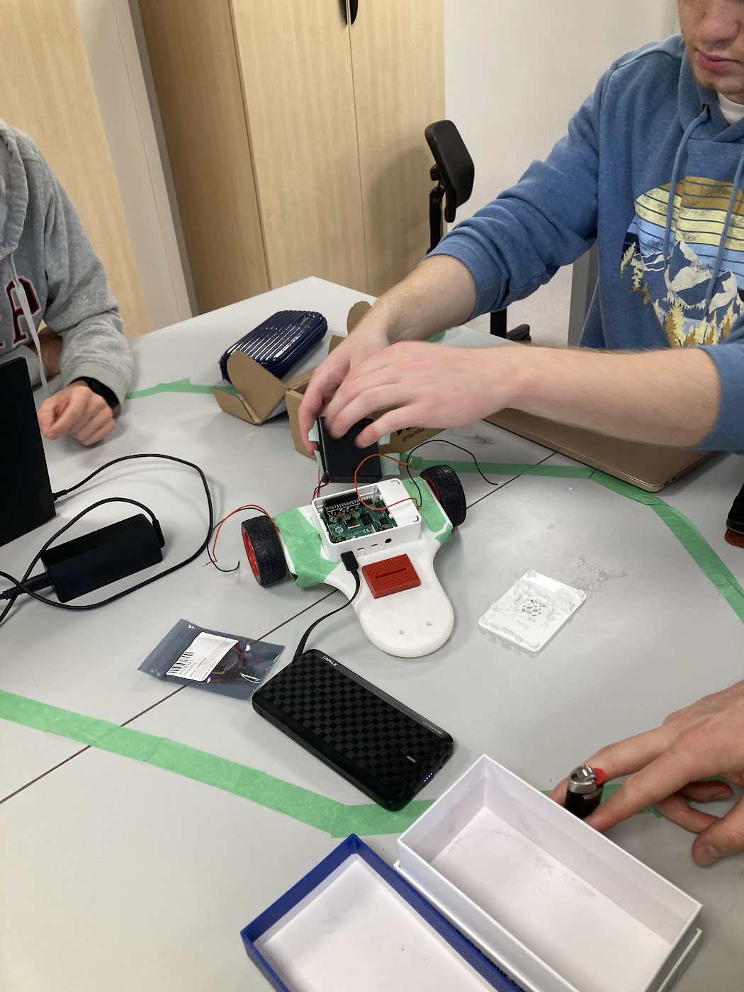 The onboard device is a raspberry pi 4, accompanied with a motor controller, a power bank, and infrared sensors.